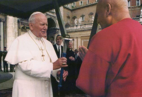The fourth audience with Pope John Paul II took place just before the Pope's weekly Mass for 15,000 people. Sri Chinmoy offered the Pope the Peace Torch with the words.