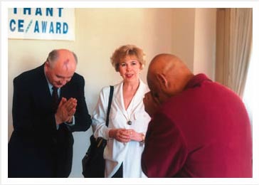 In 1994, Sri Chinmoy awarded President Gorbachev the U Thant Peace Award. In the above picture, President Gorbachev is holding the Sri Chinmoy Oneness-Home Peace Run torch with his wife Raisa Maximovna.